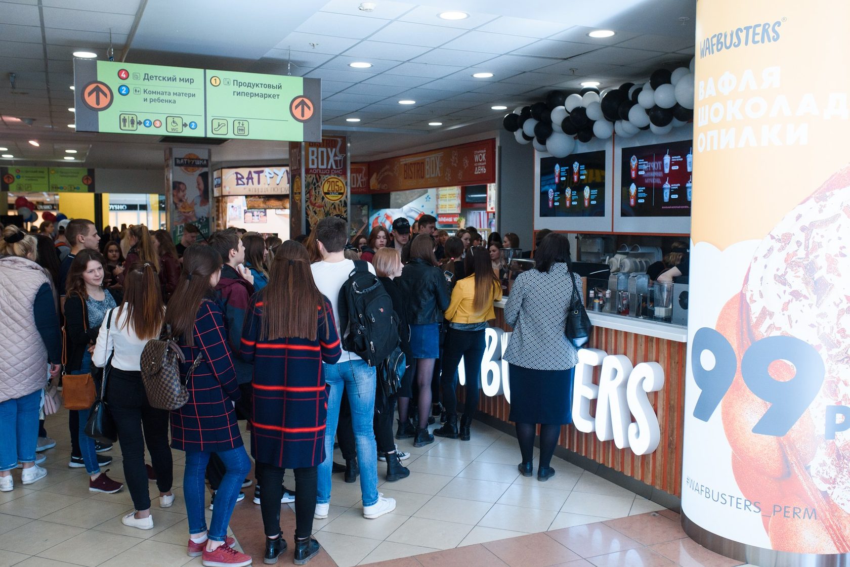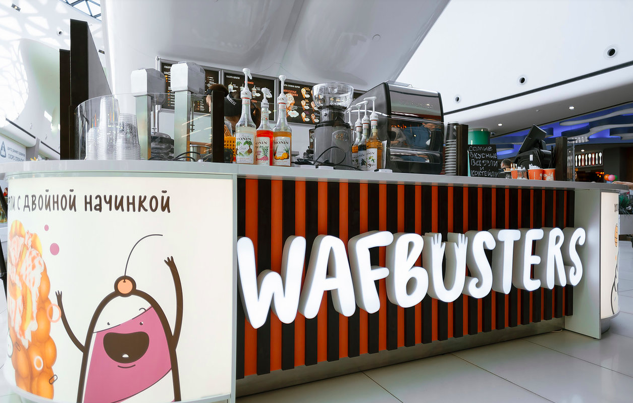 -Wafbusters Cafe 20-80 м² с посадочными местами -Wafbusters In-line в Моллах или Street-line до 35 м² -Wafbusters Unit (Торговый остров) от 12 до 18 м²